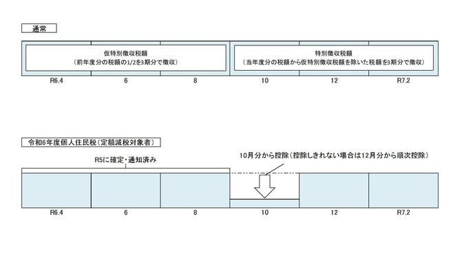 定額減税「前」の税額をもとに算出された令和6年度10月分の特別徴収税額から控除され、控除しきれない場合は、令和6年12月分以降の特別徴収税額から、順次控除されます。